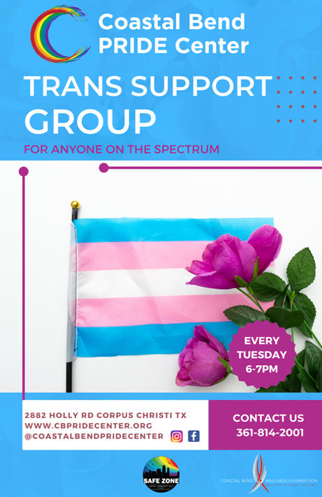 The Transgender support group currently meets every Tuesday from 6:00 to 7:00 PM at the Coastal Bend PRIDE Center.
